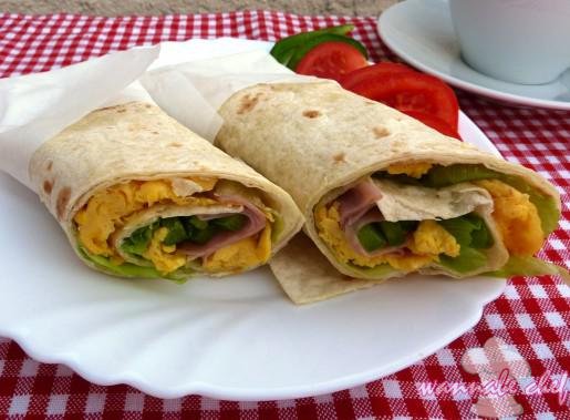 Ma reggel szomorúan vettem észre, hogy a múlt héten vásárolt hideg élelmiszer készleteim erősen megfogyatkoztak, bár gondolom sokan vannak így ezzel a hét vége felé… Nem volt más a hűtőben, csak egy kis vajkrém, pár szelet selyemsonka, tojás, saláta és egy fél kaliforniai paprika. És 1 tortilla, ami még a múlt hétről maradt. Ekkor döntöttem úgy, hogy rántottás wrap-et készítek.