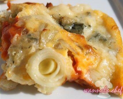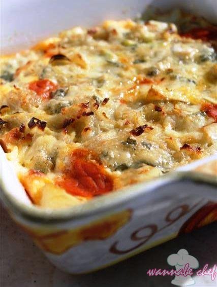 2. A tojásokat, a tejszínt sózzuk, borsozzuk, ráöntjük a hagymás krumplira és összeforgatjuk, majd rámorzsoljuk a kéksajtot is. Rákanalazzuk a tetejére a paradicsompürét, de ezt már nem keverjük bele.