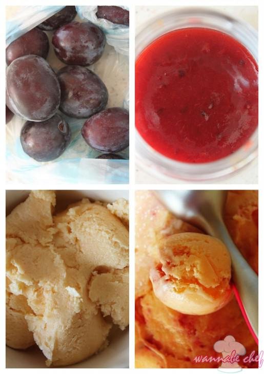 4. A fagyi tetejére öntöm a szilvakeveréket, és kanalanként beleforgatom a fagylaltba, hogy szép márványos legyen. Ilyen lett.