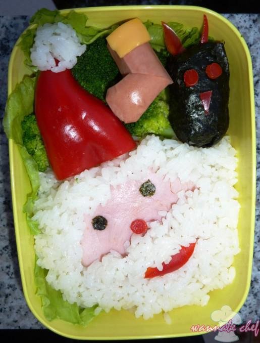 Ennek a bentonak az alapját egy húspogácsa (hamburger pogácsa) képezi, amire egy szelet sonkát borítottunk. (A Mikulás arca mégsem lehet barna, nem?) Köré párolt rizs került, a Mikulás sapkája pedig egy félbe vágott kápia paprika hegye. Az orra-szája is paprikából van, a szemei noriból.
