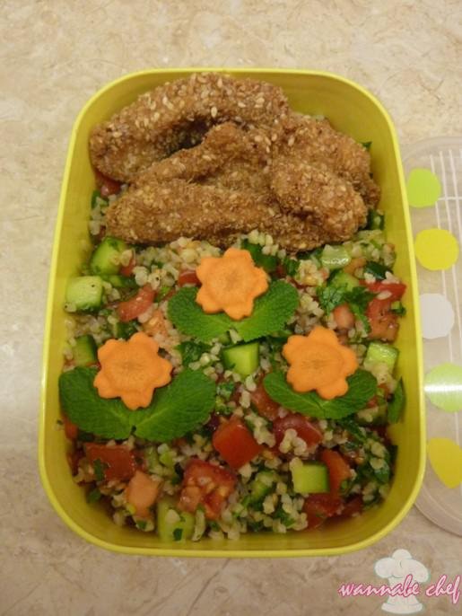 Tabboulleh bento zabkorpás-szezámmagos bundában sült csirkemellel