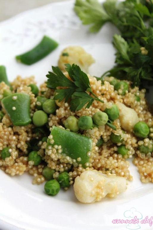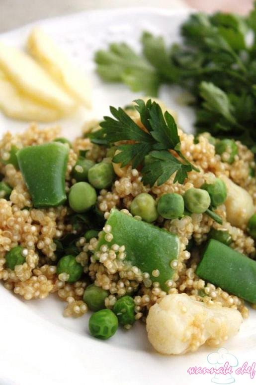 1. A quinoat felforralom dupla mennyiségű vízben (1 deci), alaposan sózom, borsozom és hozzá öntöm a narancslevet, majd újra felforralom. Kis lángon főzöm úgy 10 percig, ezalatt a folyadék nagy része elpárolog, a magok pedig megpuhulnak. Ha mégsem, akkor a tűzről levéve lefedem egy kis időre.