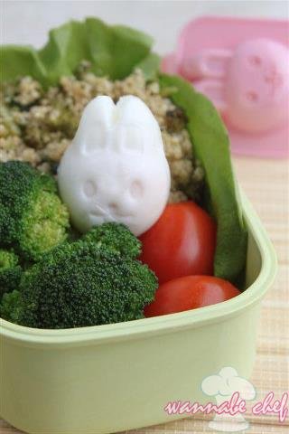 Húsvét közeledtével már alig vártam, hogy kipróbálhassam az új tojásformázómat, amit a Tchibo Webshoptól rendeltem. A kisebb méretű, keményre főzött tojás pont belefér a nyusziformába (4 féle formázó tartozik a készlethez). Ehhez nagyon jól illett egy könnyed zöldséges fogás. A quinoa jól kombinálható zöldségekkel, ezért most brokkolival készítettem. Nagyszerű bento készült belőle!