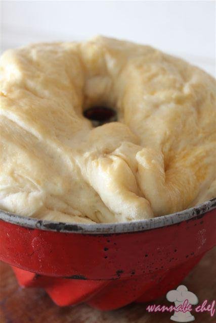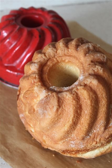 4. Amíg sül a kalács, a tészta másik felét egy kivajazott, kilisztezett kuglóf formába teszem, és a tetejét megkenem tojással. Amíg a kalács a sütőben sül, nyugodtan hagyjuk tovább kelni a formában. A kuglófot az előmelegített sütőben 170-180 fokon sütöm majd kb. 25-30 percig. Ellenőrzöm a sütőt folyamatosan, akkor lesz jó az kuglóf, amikor a pálcikára nem ragad tészta a próba alkalmával és aranyszínű a teteje. Ezután kiveszem a sütőből, kiborítom a formából.