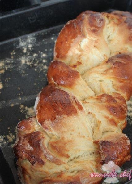 3. Az egyik darabot három egyenlő részre osztom és egyenként kisodrom, kicsit megcsavarom és a három szálat megfonom és kivajazott, kilisztezett tepsire rakom. Tojással megkenem, és 170-180 fokon 30-40 percig sütöm. A sütője mindenkinek más, akkor lesz jó a kalácsom, amikor a teteje már aranybarna, a fapálcika pedig már szárazon jön ki belőle.