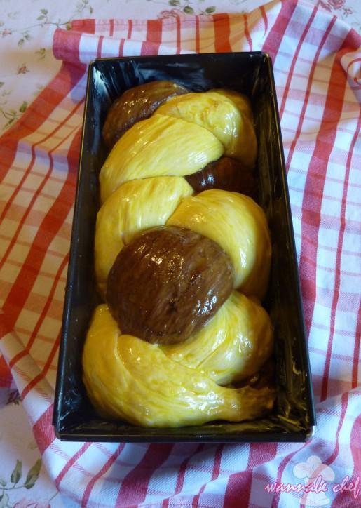 5. A fehér tésztát ketté osztjuk, külön-külön kidosorjuk. A kakaósat is kisodorjuk és összefonjuk, kivajazott sütőformába tesszük és újra megkelesztjük. Közben kétszer lekenjük a felvert tojással.