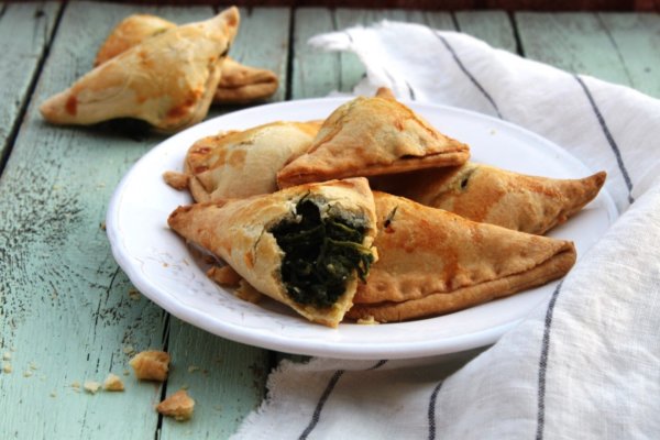 5. A tésztát 3 mm vékonyra nyújtjuk és felvágjuk kb. 13 cm oldalú négyzetekre. A széleket megkenjük vízzel, a spenótos keveréket elosztjuk a lapocskák között, a tésztát átlósan ráhajtjuk a töltelékre, és a széleket összenyomkodjuk. A csomagokat megkenjük a másik tojással, amit előzőleg kicsit felvertünk, majd késsel mindegyik táska tetejét bevágjuk.