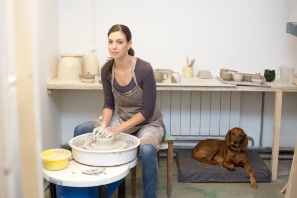 A műhelyem kicsi, de barátságos. Rengeteg polc van benne, ahol száradnak a tárgyak, vagy éppen mázazásra várnak. Van egy hosszú munkapultom, ami alatt agyagtömböket és mázzal teli vördöket tartok. A korongom pedig az egyik sarokban áll. Még a kutyámnak is tartok itt egy ágyat, arra az esetre, ha jönne velem “dolgozni”.