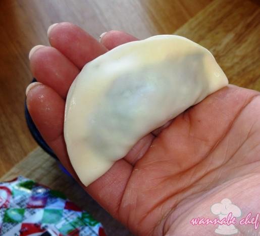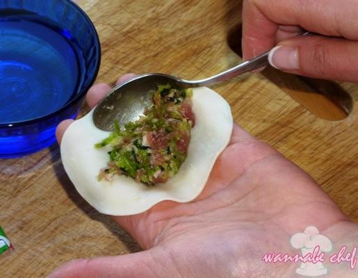 Tegyünk kb. 1 teáskanálnyi tölteléket a gyoza lapra. (Ne tömjük túl a tésztalapokat! Csak annyi tölteléket tegyünk rá, ami után még biztonságosan félbe tudjuk hajtani!)